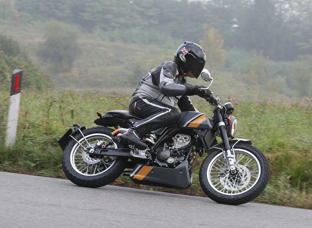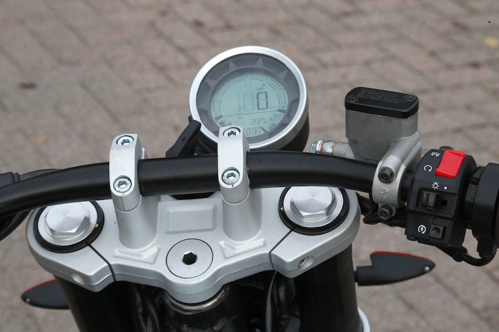 Climb aboard, and the impression of substance is maintained – this is a proper sized motorcycle, not a minibike, and for a 1.80m/5’10” rider like myself there’s a sufficiently spacious riding position allowing you to feel comfortable without being cramped, with the quite wide tapered-section handlebar delivering a relaxed but fairly upright stance that doesn’t get tiring, with lots of room to tuck my knees into the recesses of the 14-litre aluminium fuel tank. The water radiator is hidden away high up behind the headlight, and those good-looking stacked exhausts don’t obtrude too much, either, thanks to a longer right footrest which gives room for your foot to operate the linked brakes via a pedal with a combined action that’s if anything a little too abrupt – it’s initially easy to lock the rear wheel until you learn to respect the pressure the pedal delivers, since ABS isn’t fitted to the Hipster as yet – apparently only the 250 that’s coming next requires it, say Mondial staff. Working the single 280mm front disc’s radially-mounted four-piston caliper on its own via the hand lever delivers excellent stopping power, and after a while you learn the best way to blend the two different ways of slowing down. I had no issues with heat radiating off the exhausts on to my right leg, so the heat shield works. The footrests are well positioned, and play their part in delivering comfort consistent with ground clearance.