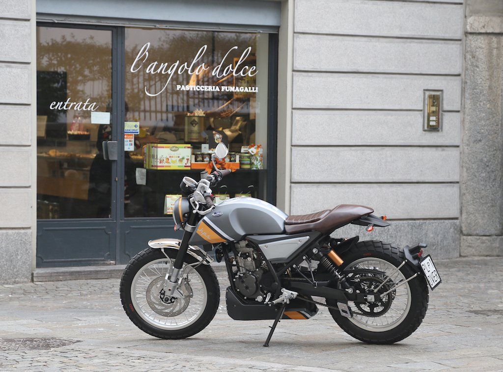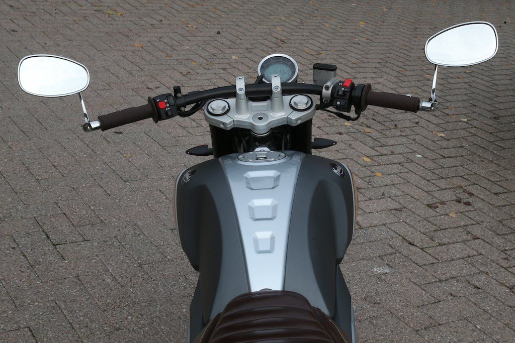 The Mondial’s engine performance made it well capable of keeping up with traffic on an autostrada, so this is not just a good-looking urban commuter – it’s equally at home on faster stretches of road where that lusty little engine can sing along at speed, with the very practical bar-end mirrors delivering a good rearwards view of the traffic you’ve just passed – they’re not as intrusive in real world use as they might seem at rest. But at lower speeds the Mondial is particularly convivial to zap around town on, with the light-action clutch and smooth pickup from the well-mapped Marelli EFI making traffic duty anything but onerous. The non-adjustable Chinese-made suspension irons out road shock quite adequately, even with just 90mm of front wheel travel available from that upside down fork, though the nostalgic-looking twin rear shocks deliver 120mm of travel, giving adequate ride comfort for such a little bike.